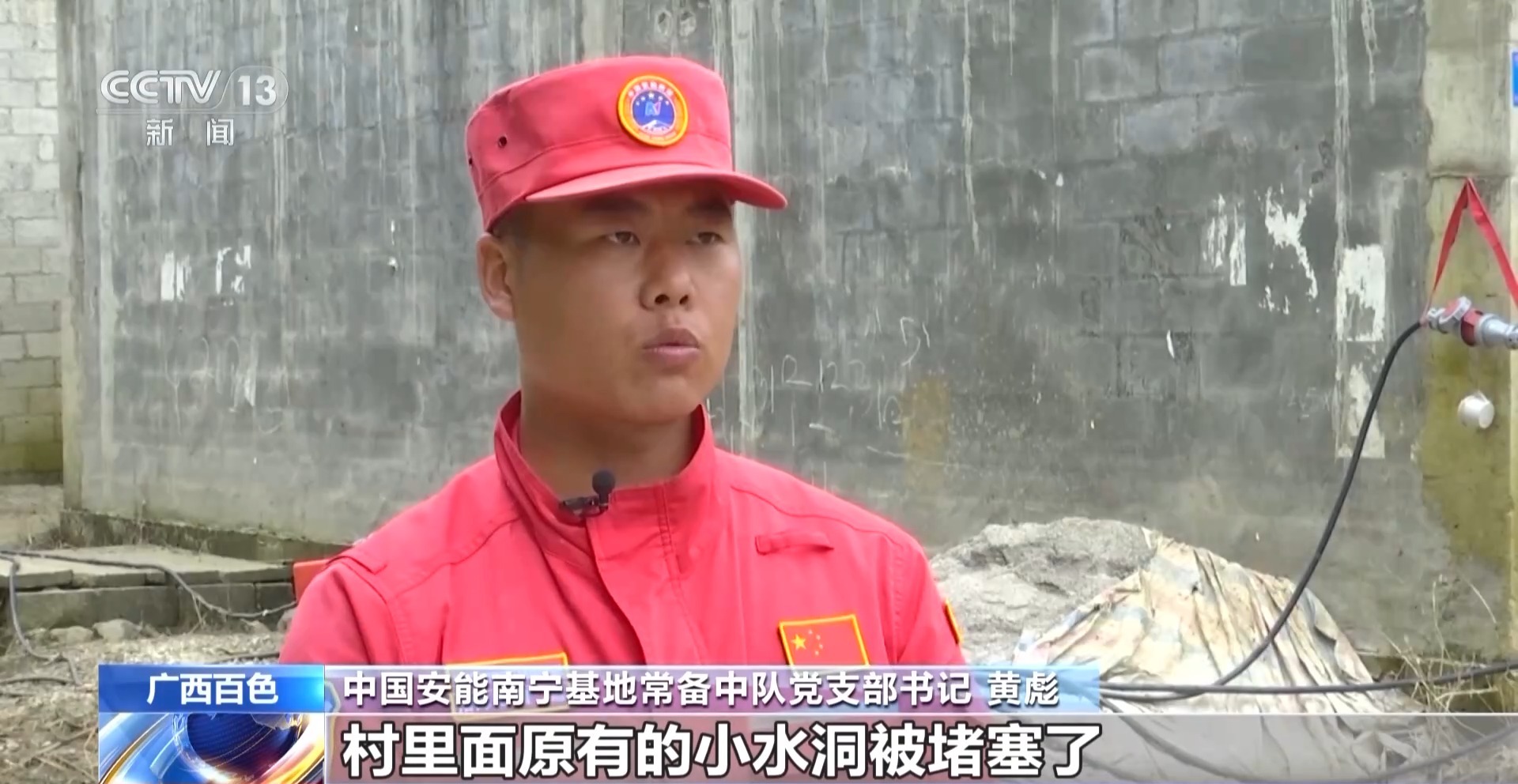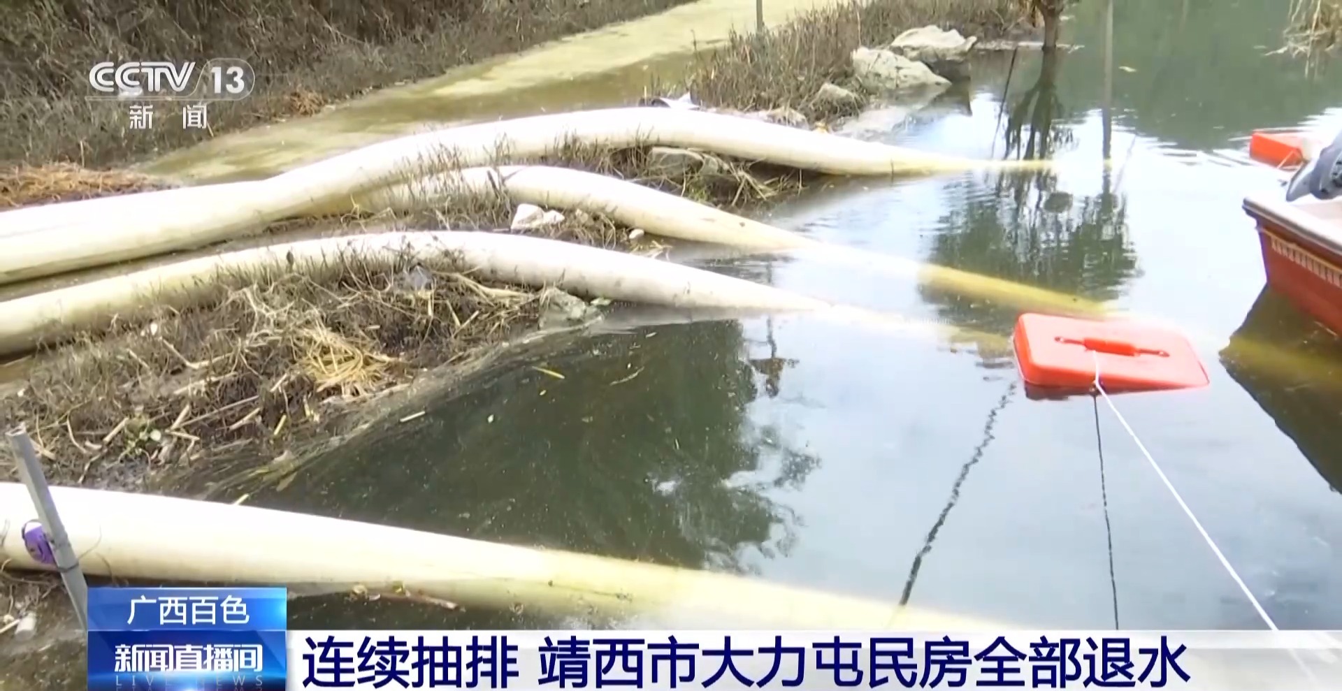 中国安能南宁基地常备中队党支部书记 黄彪:我们刚开始布置了一条25厘米直径的管路,后面不断增设管路,直至增加了4条管路,排水量越来越大,差不多一个小时下降一厘米。村里面原有的小水洞被堵塞了,导致水无法往外排。所以换了另外一个小水洞,从这个作业区域到另外一个小水洞布设管路约1.2公里。